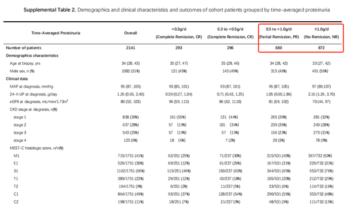 例如,2024年年底北大医院张宏教授、吕继成教授研究团队公布的《中国IgA肾病长期随访》研究,纳入了2003年-2023年就诊于北京大学第一医院肾内科的2141名IgA肾病患者。结果显示,上述患者中位尿蛋白定量为1.26g/d,其中超72%患者在研究开始时每天尿蛋白定量≥0.5g。