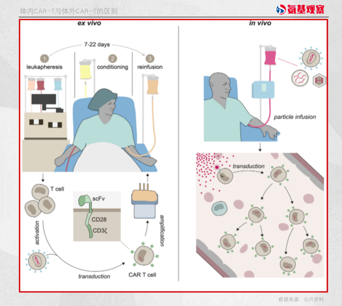 同时,体内CAR-T避免了体外生产过程中可能出现的细胞污染和变异风险,患者也不需要接受化疗方案进行清淋,保持完整的免疫系统。