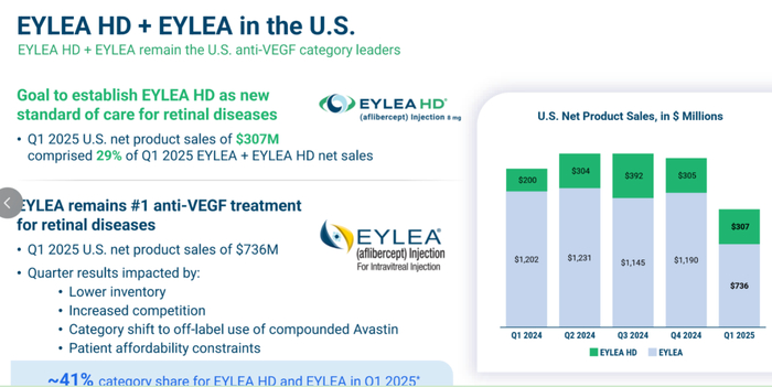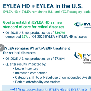 Eylea更是彻底走上下坡路。随着罗氏Vabysmo的强势冲击,以及生物类似药的不断获批,Eylea的市场份额不断被压缩。2025年一季度,Eylea(阿柏西普2mg)和Eylea HD(阿柏西普8mg)在前三个月的合计销售额为10.43亿美元,同比下降25.6%。