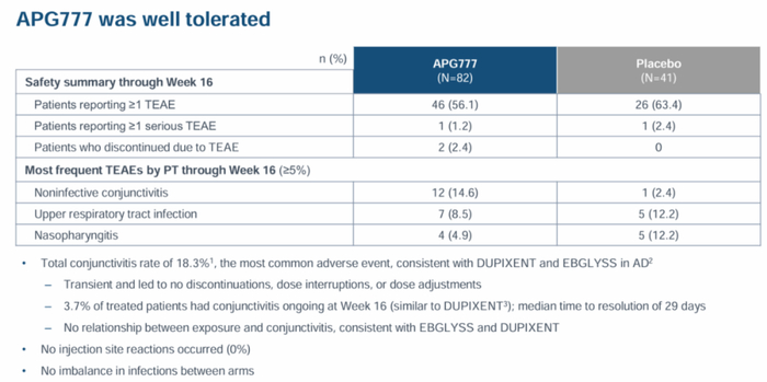 安全性方面,Apogee则表示APG777耐受性良好,安全特征与同类药物一致。APG777组严重治疗突发不良事件(TEAE)发生率1.2%,安慰剂组为2.4%;常见TEAE(≥5%)为非感染性结膜炎、上呼吸道感染和鼻咽炎(后两项APG777组发生率更低)。