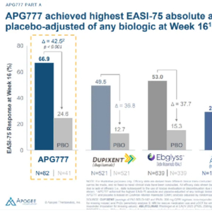 Apogee 宣称,APG777以66.9%的EASI-75应答率(湿疹面积和严重程度指数评分)创下生物制剂全球临床研究史上最高绝对疗效与安慰剂校正疗效纪录,且有望实现3-6个月超长效给药。
