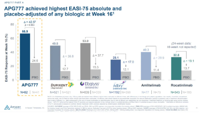 最重要的是,Apogee首席执行官Michael Henderson表示,接受APG777治疗的患者有三分之二在第16周达到EASI-75应答,无论是绝对疗效还是安慰剂校正疗效都创下全球生物制剂研究最高纪录,这强化了其作为中重度特应性皮炎潜在同类最佳疗法的地位。