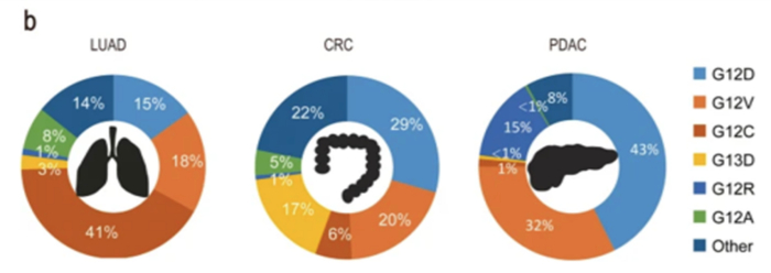 这一可能性,意味着GFH375潜在天花板已经不低,但实际上其应用场景并不局限于胰腺癌。如下图所示,KRAS G12D 是 KRAS 家族中突变频率最高的靶点之一,在肺癌、直肠癌、胰腺癌中表达量极高。若能攻克这一靶点,其临床价值将远超单一癌种。