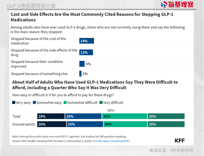 KFF统计结果显示:约14%曾使用过GLP-1类药物的成年人因费用问题停止用药,这一比例与因副作用停药的13%相近,仅有5%的患者因病情改善而停药。