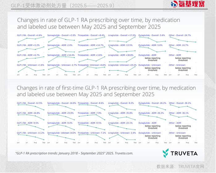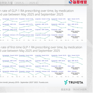 据Truveta数据显示,截至2025年9月,GLP-1RA处方在美国每100张处方中占比约6.5%。9月的总体处方率较2025年6月仅增长约4.6%——尽管处方率仍在上升,但放缓趋势已十分突出。具体表现为,2025年9月的首次处方率(首次GLP-1RA处方占总处方数的比例)较2025年6月下降12.5%。
