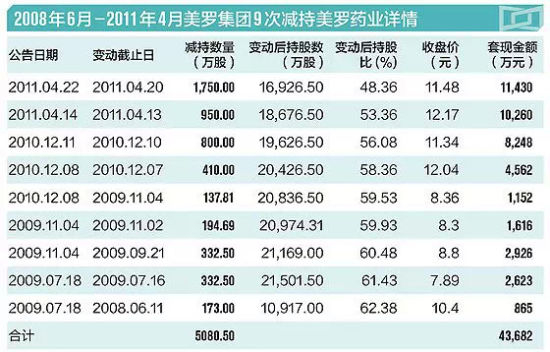 2008年6月至本次重组方案公布之前,美罗集团大规模减持共计9次,减持数量总计为5080.50万股,占美罗药业总股本的14.52%,持股数量降至1.69亿股,持股比例降至48.36%,累计套现4.37亿元,这接近于美罗药业2004年改制时收购方成本的10倍。
