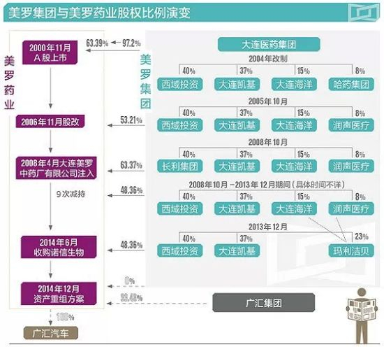 2000年11月16日,美罗药业在上海证券交易所上市,大连医药集团的持股比例由97.2%降至63.39%。2002年7月9日,美罗药业公告其控股股东由“大连医药集团有限公司”更名为“大连美罗集团有限公司”。