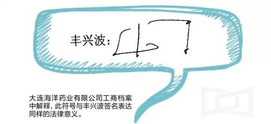 在2006年2月大连海洋药业有限公司的工商档案中,作为公司股东的丰兴波,签名为非常奇怪的符号,该公司工商档案对此有所解释,此符号与丰兴波签名表达同样的法律意义。