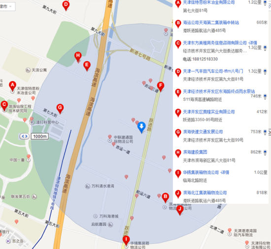 百度地图显示,瑞海公司临近天津港和海滨高速公路,周围分布着多家物流公司。距公司直线距离不到1000米附近,小编粗略看了下,包括中国一重、中集集装箱公司、天津泰达科技发展集团、中储股份天津新港分公司、中海油工业自控有限公司、五矿物流集团天津集装箱有限公司等40余家公司。