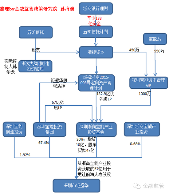 2、回到浙商银行理财资金,从财新的报道,笔者并没有看到200亿资金走向,但至少130多亿的资金直接来自浙商银行理财,受让五矿信托的受益权,五矿信托通过浙银资本投向华福证券的资管计划,并最终成为钜盛华增持万科的7个基金专户的劣后资金。