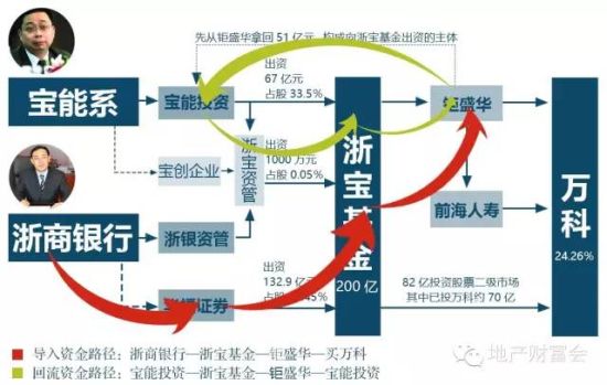 第二条路径是导出流。除了左手倒右手这种常规玩法,姚老师再次证明了花自己的钱买东西不算本事!姚老师先质押了钜盛华持有的7.28亿股万科股票,融了51亿元给宝能投资,加上东拼西凑16亿共计出资67亿做“诱饵”兜底资金,再巧立“浙宝基金”这一名目,用2倍杠杆引入张长弓的132.9亿元银行理财资金,最终一并注入钜盛华。