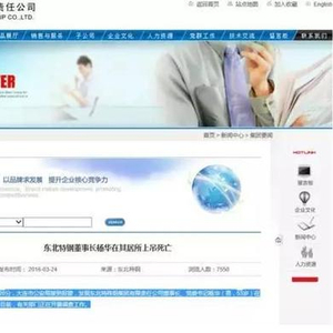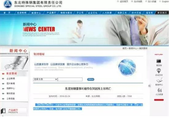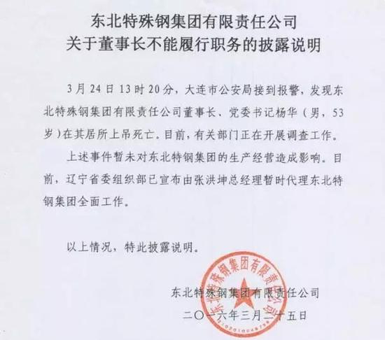 3月24日,东北特钢官网发布消息,“3月24日13时20分,大连市公安局接到报警,发现东北特殊钢集团有限责任公司董事长、党委书记杨华(男,53岁)在其居所上吊死亡。目前,有关部门正在开展调查工作。”