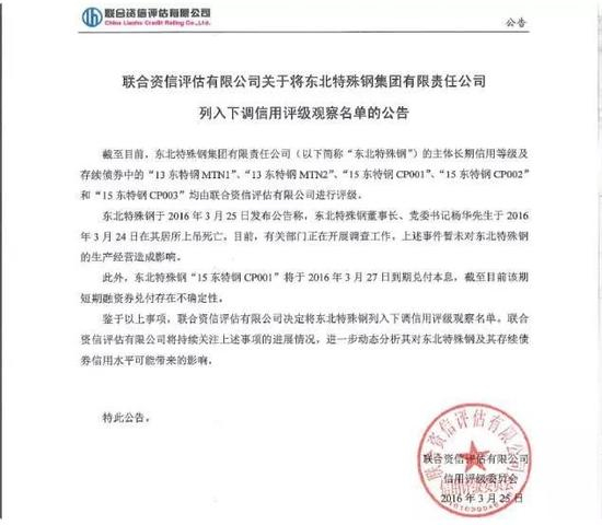 一天后,东北特钢发布公告称,由于流动性紧张,本息偿付存不确定性,27日到期的8亿元债券或面临违约。