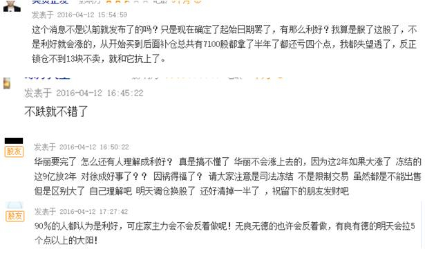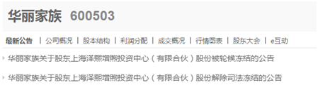 好吧,我们还是关心下华丽家族怎么回事。事实上,自从去年11月1日徐翔被扣之后,与他所持有的多家公司的股份被公安局陆续冻结。华丽家族就在11月10日公告,上海泽熙增煦投资中心(有限合伙)持有的华丽家族(证券代码600503)9000万股无限售流通股及孳息。冻结期限从2015年11月10日至2017年11月9日。