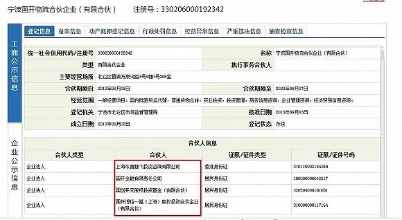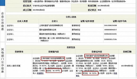 宁波国开企业信息查询宁波国开工商登记信息可知,该有限合伙企业成立2013年8月8日。同年9月3日,投资人股权变更,合伙人中的国开博裕一基(上海)股权投 资合伙企业和上海东直捷飞投资咨询有限公司(下称东直捷飞)持股比例有所调整。按照工商变更时的信息显示,国开博裕持有宁波国开58.7237%的股权。