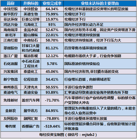 每经投资宝注意到,在大部分上市公司针对并购标的业绩承诺未完成的解释中,“宏观经济下行”几乎是必提的缘由。合计有超过20家公司表示,“宏观经济下行”是其并购标的业绩没有达标的最大因素。
