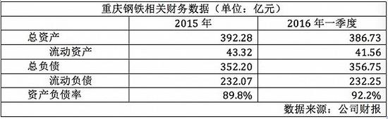 根据Wind统计数据,今年一季度末,钢铁行业上市公司平均资产负债率为69.72%,同期重庆钢铁的资产负债率从去年底的89.8%升至92.2%,远超行业平均水平。截至一季度末,重庆钢铁短期借款余额38.09亿元,应付账款93.47亿元,短期偿债压力较大。