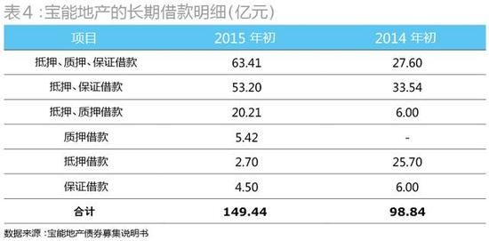 且不说万科这样净利润超百亿的公司都需要向金融机构大举借债,自身供血能力不足的宝能地产更是不消说,极 度依赖举债度日。其2014年借款总额超过162亿元,长期借款达到149.4亿元,其中绝大部分为抵押、质押等各种手段保证的借款(表4)。在2015 年发行30亿元债券之前,其资产负债率已从2012年的56.3%上升到了77.25%。