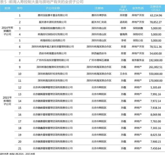 尽管这样,通过观察前海人寿设立的子公司,我们还是发现了一些端倪(表5)。前海人寿的21家子公司中,除了前海保险销售有限公司、前海世纪保险经纪有限公司、前海保险公估有限公司这三家与保险主业相关,其他18家几乎全部为房地产相关业务。