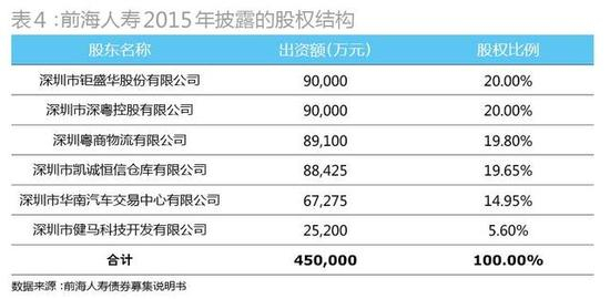 2016年2月,前海人寿再次增资,整体注册资本由45亿元猛增至85亿元。与这次增资相同步的是,还伴 随着外部股东的完全退出。在前海人寿数年来增资中作为配角的健马科技和广州立白将手中的股权悉数转让,彻底退出了前海人寿。根据前海人寿的年报及债券说明 书推测,应该是健马科技先受让了广州立白1亿元的注册资本,再将这5.6%的持股(合计2.52亿元注册资本)转让给钜盛华(表4)。