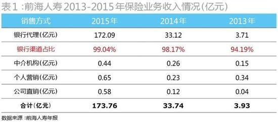 不能不说,前海人寿是险资中的一匹黑马,其2012年正式开业,2013年度保险业务收入(即保监会的 “原保险保费收入”指标)3.93亿元,2015年度保险业务收入已经达到了173.76亿元,2年时间增长了44倍。根据保监会发布的数据,按2015 年度原保险保费收入规模核算,前海人寿在全国中资人身险公司中排名第16位。这样狂飙突进的增长,是极度依赖银保渠道的结果。银行代理销售方式对前海人寿 业务占比近三年来一直高居90%以上,2015年更是已经高达99%(表1)。