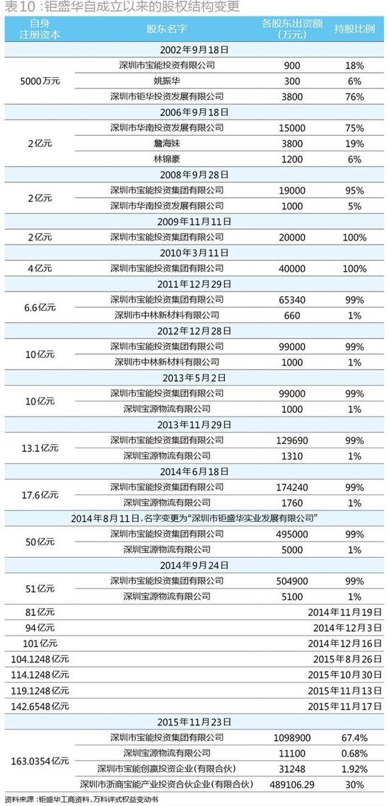 从股权结构上看,自控股前海人寿后,在可以追溯的工商资料中,很长一段时间内,钜盛华的注册资本从6.6 亿元增加至101亿元期间,皆由姚振华本人独资控制的宝能投资集团持股99%。万科披露的详式权益变动报告书显示,钜盛华的注册资本已增加至163.04 亿元,并又引入了深圳市宝能创赢投资企业(有限合伙)(以下简称“宝能创赢合伙”)、深圳市浙商宝能产业投资合伙企业(有限合伙)(简称为“浙商宝能合 伙”)两家新股东。