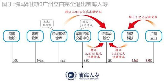 此外,凯诚恒信、华南汽车交易中心也将持有的前海人寿部分股权转让给钜盛华,钜盛华得以实现51%绝对控 股(图3)。工商资料显示,凯诚恒信、华南汽车交易中心在前海人寿中地位弱化后进一步更名。其中,凯诚恒信更名为凯信恒有限公司,而华南汽车交易中心则更 名为金丰通源有限公司。