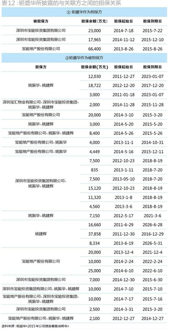 前海人寿与宝能地产的合作,前期在明处—大量收购、注资、增资宝能地产的子公司,后期则隐身,演变成收购 与宝能亲密合作的建业系子公司,关联交易非关联化的痕迹明显。保监会2011年发文,明令禁止保险公司、保险资产管理公司对外担保。除了已收购的子公司, 前海人寿无法直接通过担保的方式来为宝能地产增信,但是前海人寿的控股股东钜盛华,与宝能地产之间的业务、资金往来就没有这方面的规制了。钜盛华 《2015年公司债券募集说明书》中,关联方交易及往来的情况说明占了六页(P57-62),钜盛华、宝能投资集团、宝能地产等等相关公司的资金拆借、相 互担保、关联交易、应收及应付款等比比皆是,本文仅选取担保一项供读者查看(表12)。