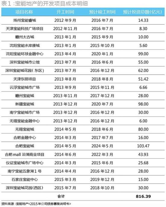 每一个房地产商最要紧的就是筹钱,宝能地产又岂能例外。2013-2014年间,宝能地产在全国各地四处 扩张:赣州太古城、沈阳宝能环球金融中心、天津东丽项目、新疆宝能城、无锡宝能城、合肥宝能城……这些项目动辄就是几十亿元的开发成本,而每个项目都是嗷 嗷待哺。宝能地产2015年发布的债券募集说明书显示,这些项目总的开发成本合计超过816亿元(表1)!