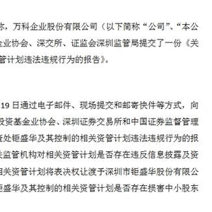 公告称,7月19日,有媒体报道称,公司已向中国证监会、证券投资基金业协会、深交所、证监会深圳监管局提交了一份《关于提请查处钜盛华及其控制的相关资管计划违法违规行为的报告》。公司确于7月18日和19日通过电子邮件、现场提交和邮寄快件等方式,向中国证券监督管理委员会、中国证券投资基金业协会、深圳证券交易所和中国证券监督管理委员会深圳监管局提交了《关于提请查处钜盛华及其控制的相关资管计划违法违规行为的报告》,请求相关监管机构对相关资管计划是否存在违反信息披露及资产管理业务等相关法律法规的规定、相关资管计划将表决权让渡予深圳市钜盛华股份有限公司的合法性及钜盛华及其控制的相关资管计划是否存在损害中小股东权益等事项进行核查。