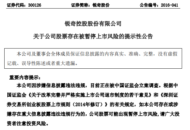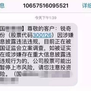 是什么原因导致暴跌?今日有一则消息与它有关,不少券商及营业部投资顾问都在各自的朋友圈转发“请注意回避锐奇股份,因该公司被立案调查,存在可能被暂停上市的风险,请周知。”的消息。亦有投资者收到如下短信: