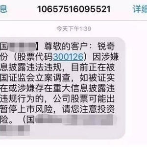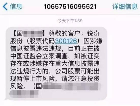 是什么原因导致暴跌?今日有一则消息与它有关,不少券商及营业部投资顾问都在各自的朋友圈转发“请注意回避锐奇股份,因该公司被立案调查,存在可能被暂停上市的风险,请周知。”的消息。亦有投资者收到如下短信: