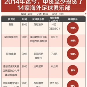21世纪经济报道记者根据公开资料整理发现,2014年以来中国资本至少已对海外14家足球俱乐部进行了投资,其中有11家取得控股权;除了6家未披露金额的收购外,交易涉及资金约69.372亿元人民币。
