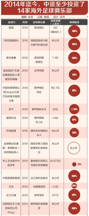 21世纪经济报道记者根据公开资料整理,2014年以来中国资本至少已对海外14家足球俱乐部进行了投资,其中有11家取得控股权;除了6家未披露金额的收购外,交易涉及资金约69.372亿元人民币。