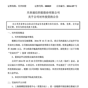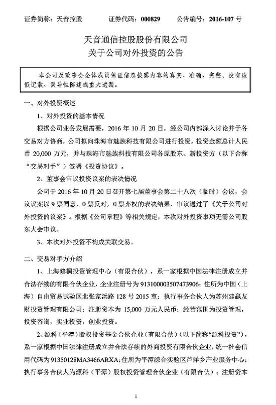 新浪财经讯 10月20日消息,天音控股公告称,公司拟向珠海市魅族科技有限公司进行投资,投资金额总计人民币2亿元,并与珠海市魅族科技有限公司各原股东、新投资方签署《投资协议》。投资标的主要经营范围为计算机软件开发、手机的开发、生产和销售等。具体公告如下: