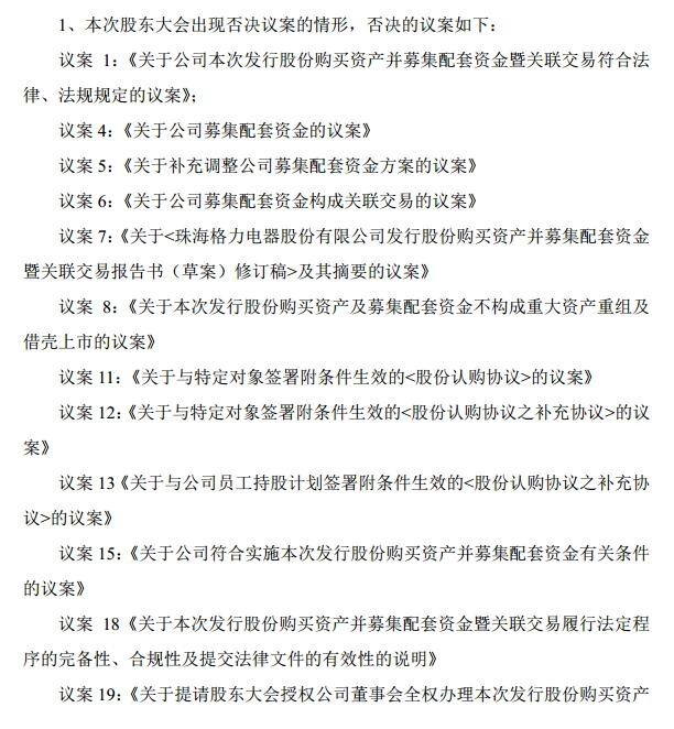 3)两条同时涉及收购资产以及募集资金的总纲型的议案被否决。包括议案1《关于公司本次发行股份购买资产并募集配套资金暨关联交易符合法律、法规规定的议案》、议案7《关于<珠海格力电器股份有限公司发行股份购买资产并募集配套资金暨关联交易报告书(草案)修订稿>及其摘要的议案》。