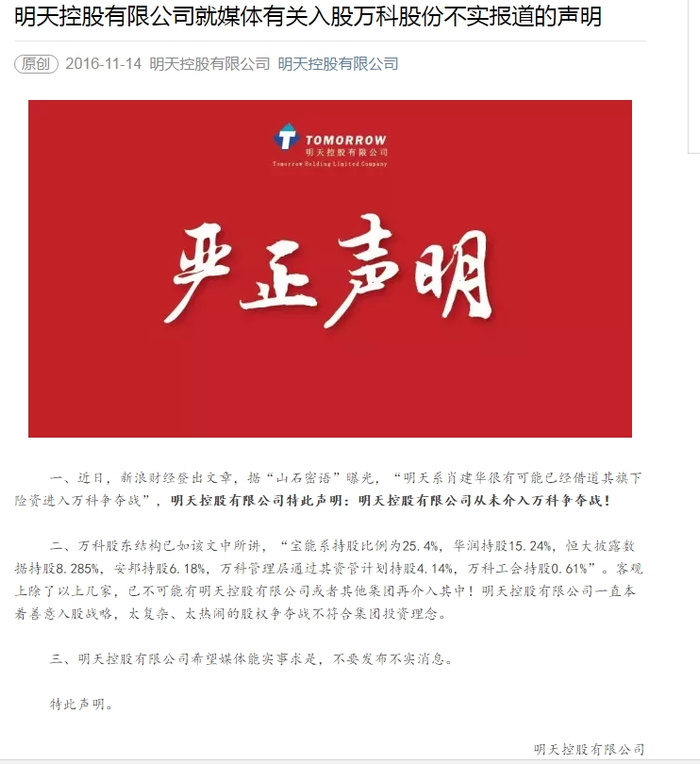 这篇声明称:万科股东结构已如该文中所讲,“宝能系持股比例为25.4%,华润持股15.24%,恒大披露数据持股8.285%,安邦持股6.18%,万科管理层通过其资管计划持股4.14%,万科工会持股0.61%”。客观上除了以上几家,已不可能有明天控股有限公司或者其他集团再介入其中!明天控股有限公司一直本着善意入股战略,太复杂、太热闹的股权争夺战不符合集团投资理念。