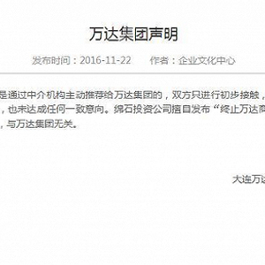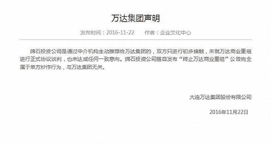 11月22日下午3时左右,万达集团官方网站发布声明,直斥对方单方面炒作:“绵石投资公司是通过中介机构主动推荐给万达集团的,双方只进行初步接触,未就万达商业重组进行正式协议谈判,也未达成任何一致意向。绵石投资公司擅自发布‘终止万达商业重组’公告完全属于单方炒作行为,与万达集团无关。”