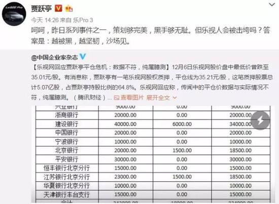 新华社进一步称:在过去的几年里,贾跃亭本人已经频繁通过质押股份形式来获取资金。据Wind数据显示,从2013年开始,贾跃亭和其姐姐贾跃芳开始频繁质押所持乐视网股份,截至上月,已累计质押乐视网股份达38次(含到期后重新质押)。昨日乐视网股价跌破平仓线后随即被迅速拉起,收盘价格也保持在平仓线之上,恰恰也佐证了似有资金为贾跃亭的质押盘保驾护航。