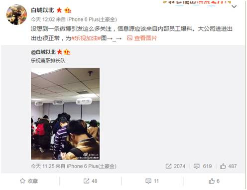 今日,有微博网友@白城以北爆料曝光了一张乐视员工在公司HR服务中心排队办理离职手续的照片。