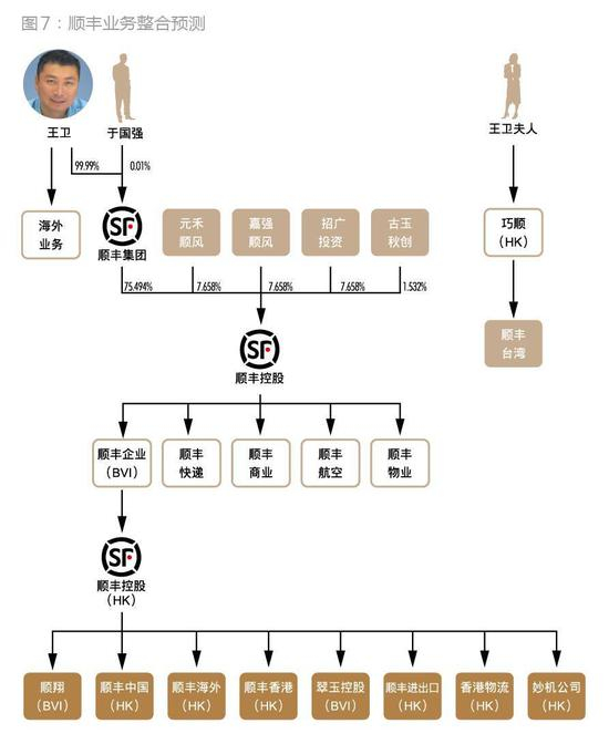 当然,如果投资人对王卫有着足够的信任,可以先借款给王卫,双方同比例对顺丰控股增资后收购顺丰的海外业务,由此将顺丰的海外业务整合至顺丰控股旗下,顺丰控股的业务架构得以完成(图7)。