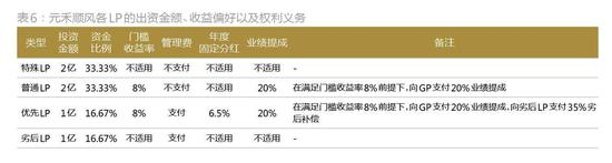 同时根据投资偏好的不同,元禾控股将各有限合伙人划分成了特殊LP、优先LP、普通LP以及劣后LP(图5),并明确了相应的投资收益标准及权利义务(表6)。