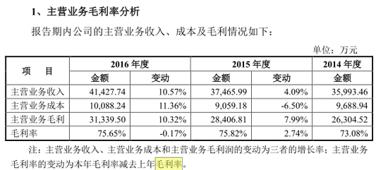 招股书显示,2013年度、2014年度、2015年度和2016年1-6月,公司的主营业务毛利率分别为73.29%、73.08%、75.82%和74.23%。