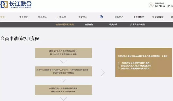 在现货交易过程中,长江联合的会员单位则负责吸收投资者。长江联合官网对会员申请及审批流程作出详细解释,申请会员单位须要提交商业计划书后,长江联合会对申请企业进行尽职调查,申请单位通过初审并缴齐相关费用后,长江联合发出《入会通知书》,并安排申请单位进行工商注册等,方可正式上线业务。