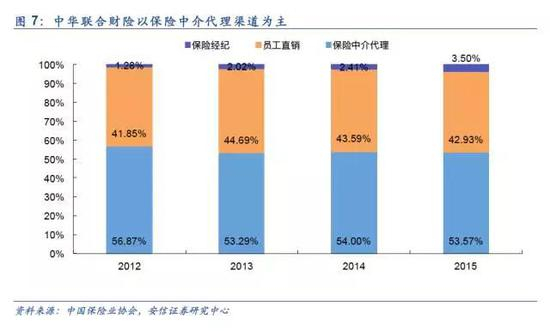 中华联合财险保险中介业务占比维持50%以上。中华控股的销售方式主要分为保险中介代理、员工直销和保险经纪。2015年保险中介代理业务(通过保险代理人和保险代理公司为中华控股做销售推广)占比53.57%,员工直销业务(受益于电销和网络销售的兴起)占比达42.9%,保险经纪业务(提供针对性保险服务)则占比3.5%,近年来中华联合财险的保险中介业务占比维持50%以上。