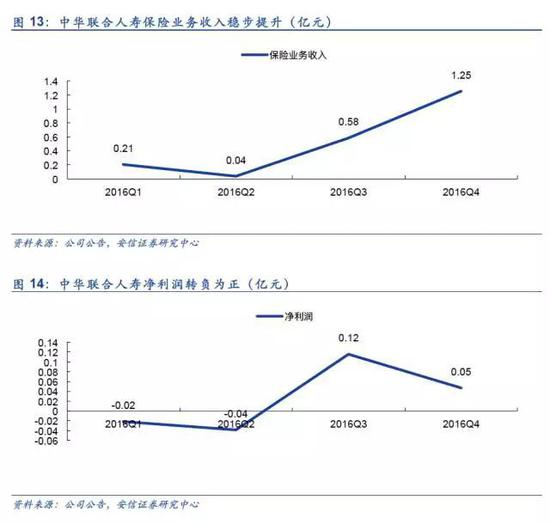 中华联合人寿处于初步发展阶段。2015年11月中华联合保险控股股份有限公司的子公司中华联合人寿保险股份有限公司获得了中国保险监督管理委员会的批复正式成立。2016年公司实现保险业务收入1.25亿元(比上季度提升115.5%),其中90%为保户投资款新增交费,而2016年公司实现净利润0.05亿元,中华联合人寿净利润自三季度以来就扭亏为盈,未来发展预期较好。公司目前处于初步发展阶段,未来保险业务结构将进一步优化。