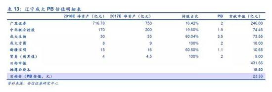 预计2017年广发证券贡献市值246亿元(2倍PB),中华联合控股贡献市值74亿元(1.9倍PB),成大生物贡献市值73.6亿元(3.5倍PB),成大方圆贡献市值18亿元(2倍PB),新疆宝明贡献市值10.7亿元(1.1倍PB),贸易方面贡献市值9亿元(2倍PB),公司目标市值431.7亿元,摊薄后股本18.5亿股,目标价23.33元。