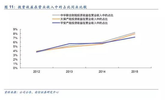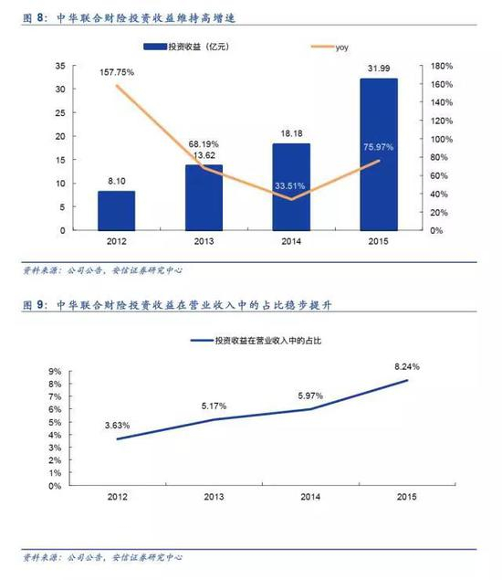 中华联合财险投资收益维持较高增速。2012年以来中华联合财险投资收益同比增速维持在10%以上,2015年中华联合财险投资收益达到32亿元,同比增长76%。此外,投资收益在营业收入中的占比维持稳步提升态势,2015年公司该占比为8.24%。