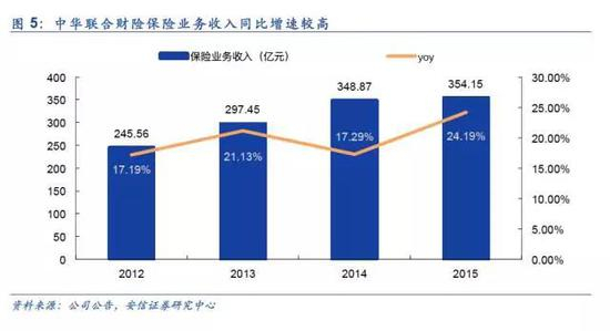 中华联合财险保险业务收入同比增速较高。2012年至2015年公司保险业务收入同比增速较高,维持在17%以上。
