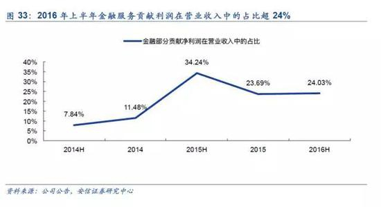 金融服务贡献利润在营业收入中的占比维持高位。2015年中以来金融业务贡献的利润在营业收入中的占比维持在23%以上的高位,2016年上半年广发证券实现归属公司的投资收益6.62亿元,中华保险实现归属公司的投资收益2.52亿元,二者加总在营业收入中的占比超过24%,带动公司业绩提升。